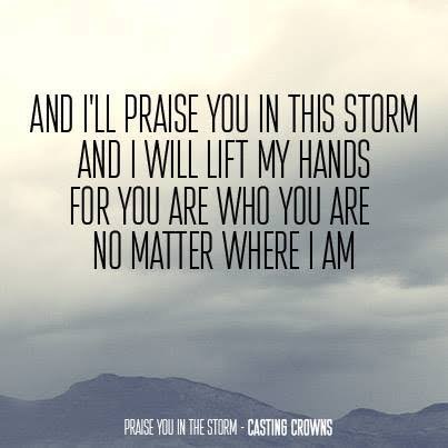 I’ll praise You in this storm, and I will lift my hands. For You are who You are no matter where I am. And every tear I’ve cried You hold in Your hand. You never left my side and though my heart is torn, I will praise You in this storm.